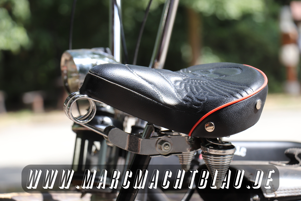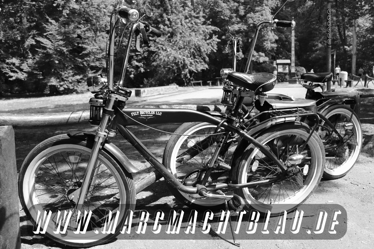 Er ist ein ehemaliger Harley Fahrer und schraubt gerne. Die Räder hat er absolut nackt gekauft. Sie sahen, laut ihm, aus wie BMX (was das Zubehör angeht). Was er daraus gemacht hat kann sich aber definitiv sehen lassen.