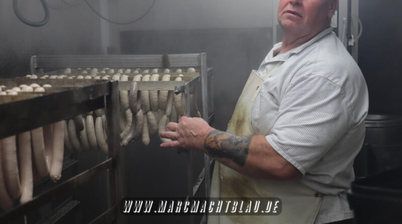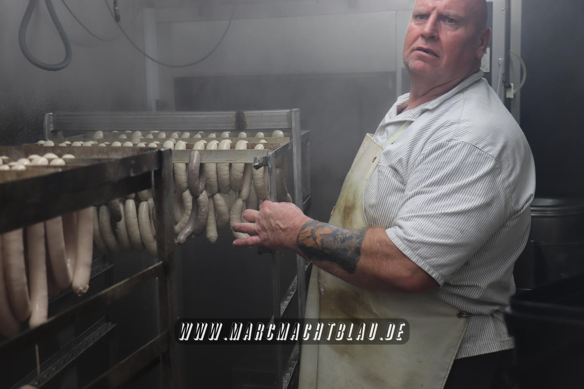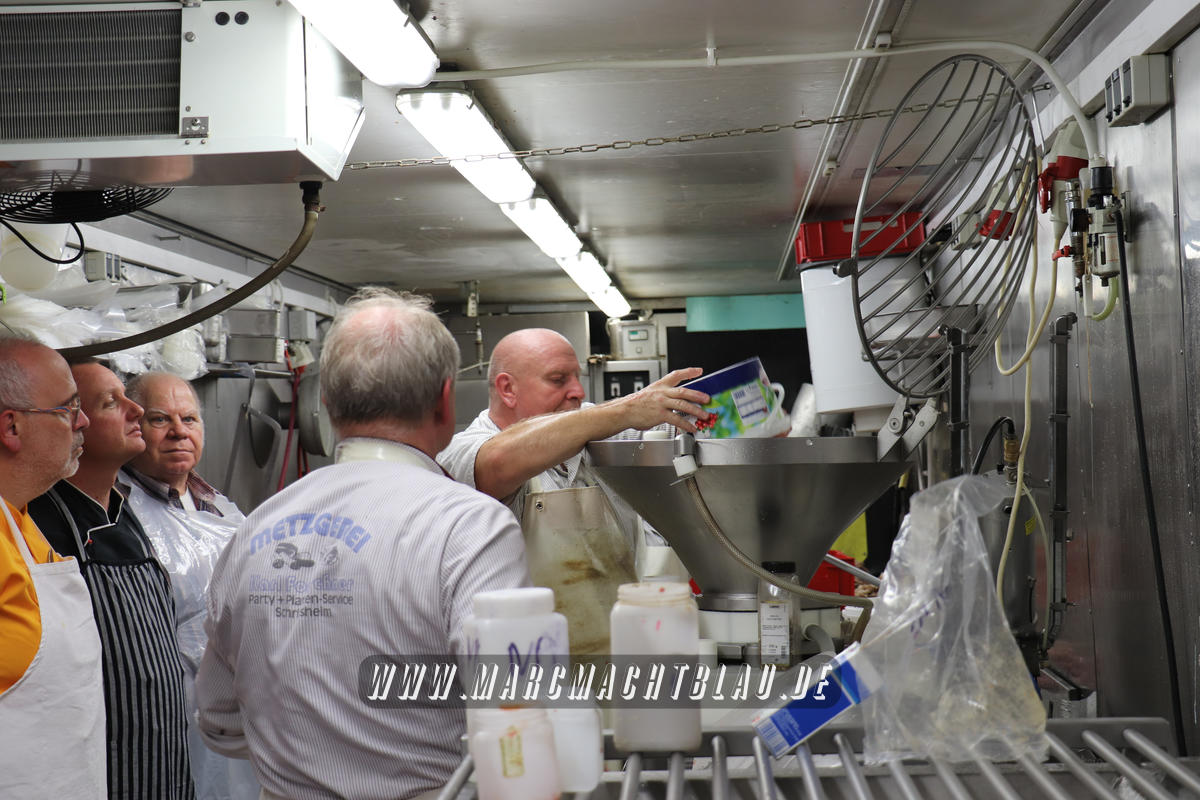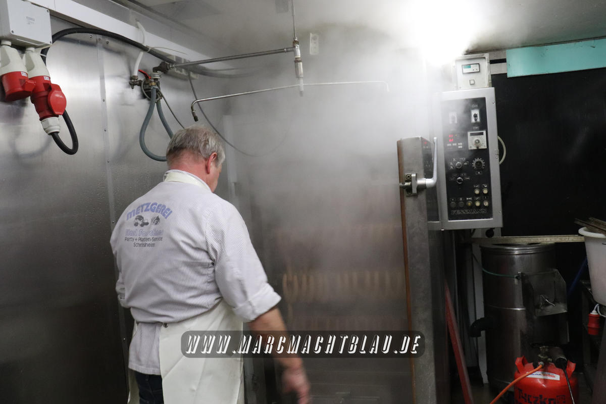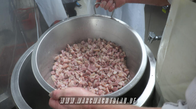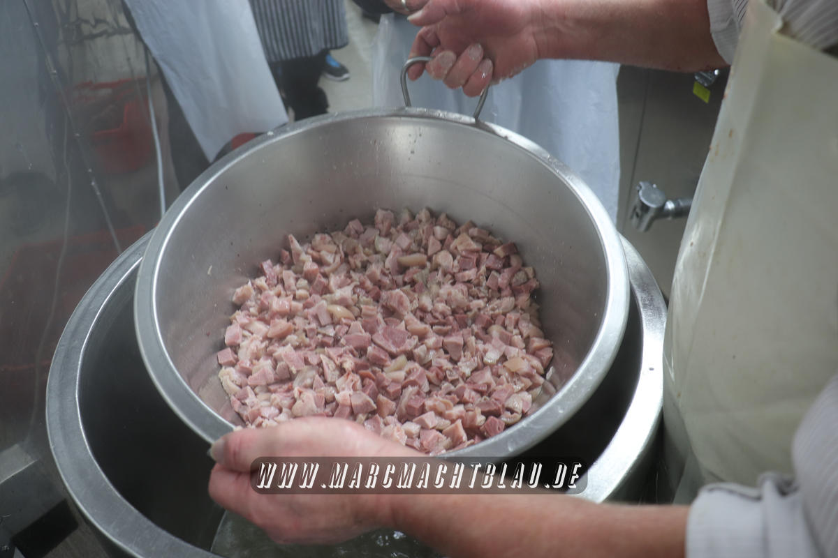Wir betreten das erste Mal die “Heilige Halle des Karl”. Ein großer sehr sauberer Raum mit vielen unterschiedlichen Maschinen, übergroße Töpfe, Kippbratpfanne, Cutter, Fleischwolf Wurstfüller, großen Arbeitsflächen und seinem ganzen Stolz dem Räucherofen. Eine tolle professionelle Ausrüstung und wir sehen auch warum. Wie und was für eine Qualität an Wurst, Karl und seine zwei Kollegen herstellen ist wirklich beeindruckend.