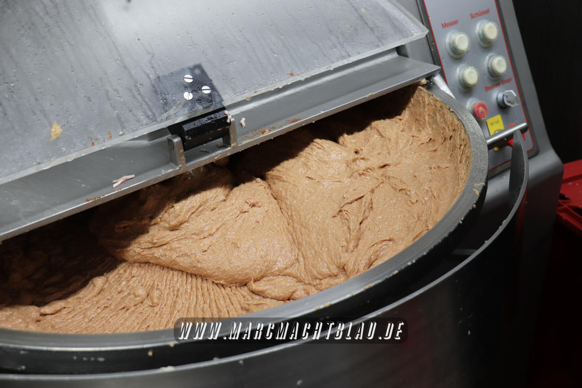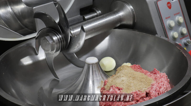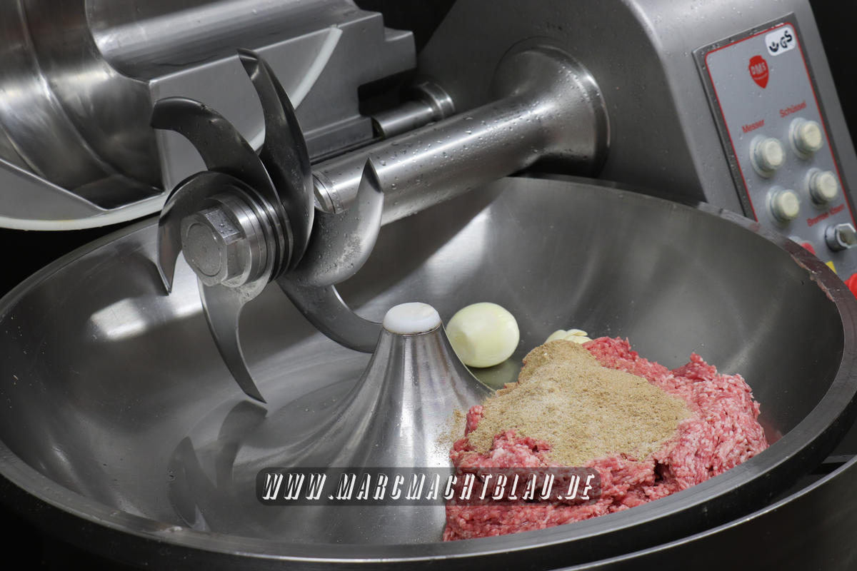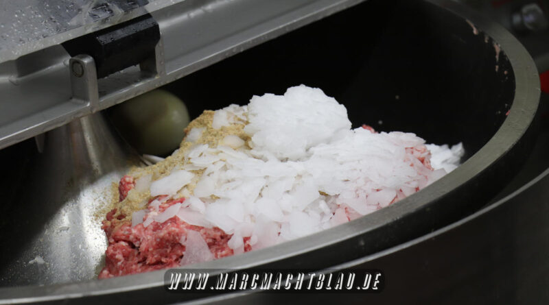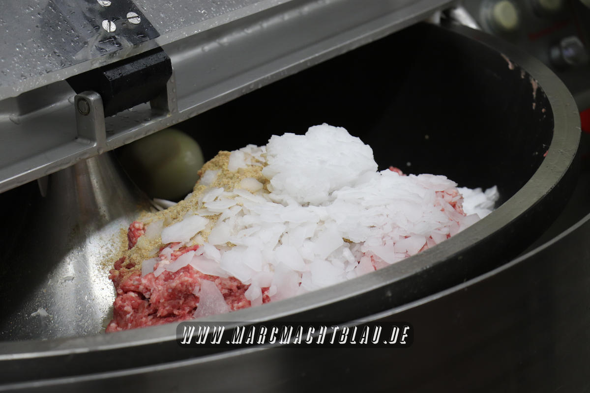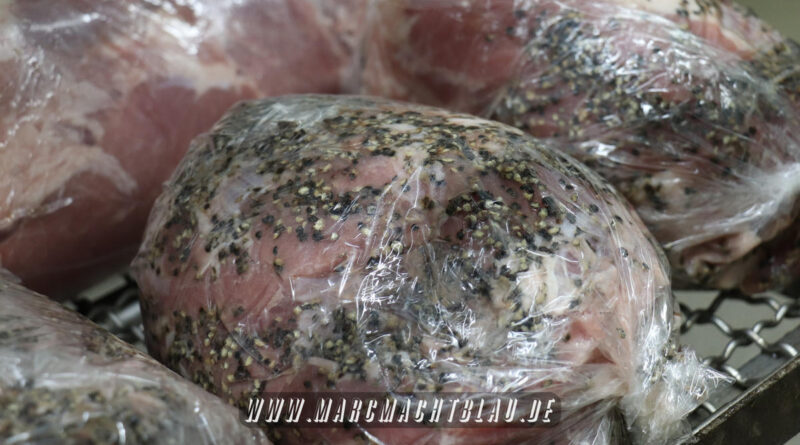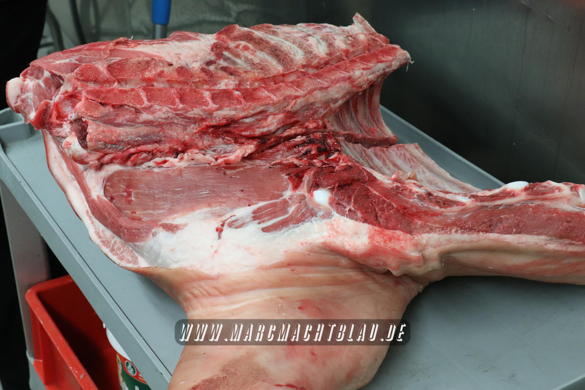 Wir betreten das erste Mal die “Heilige Halle des Karl”. Ein großer sehr sauberer Raum mit vielen unterschiedlichen Maschinen, übergroße Töpfe, Kippbratpfanne, Cutter, Fleischwolf Wurstfüller, großen Arbeitsflächen und seinem ganzen Stolz dem Räucherofen. Eine tolle professionelle Ausrüstung und wir sehen auch warum. Wie und was für eine Qualität an Wurst, Karl und seine zwei Kollegen herstellen ist wirklich beeindruckend.