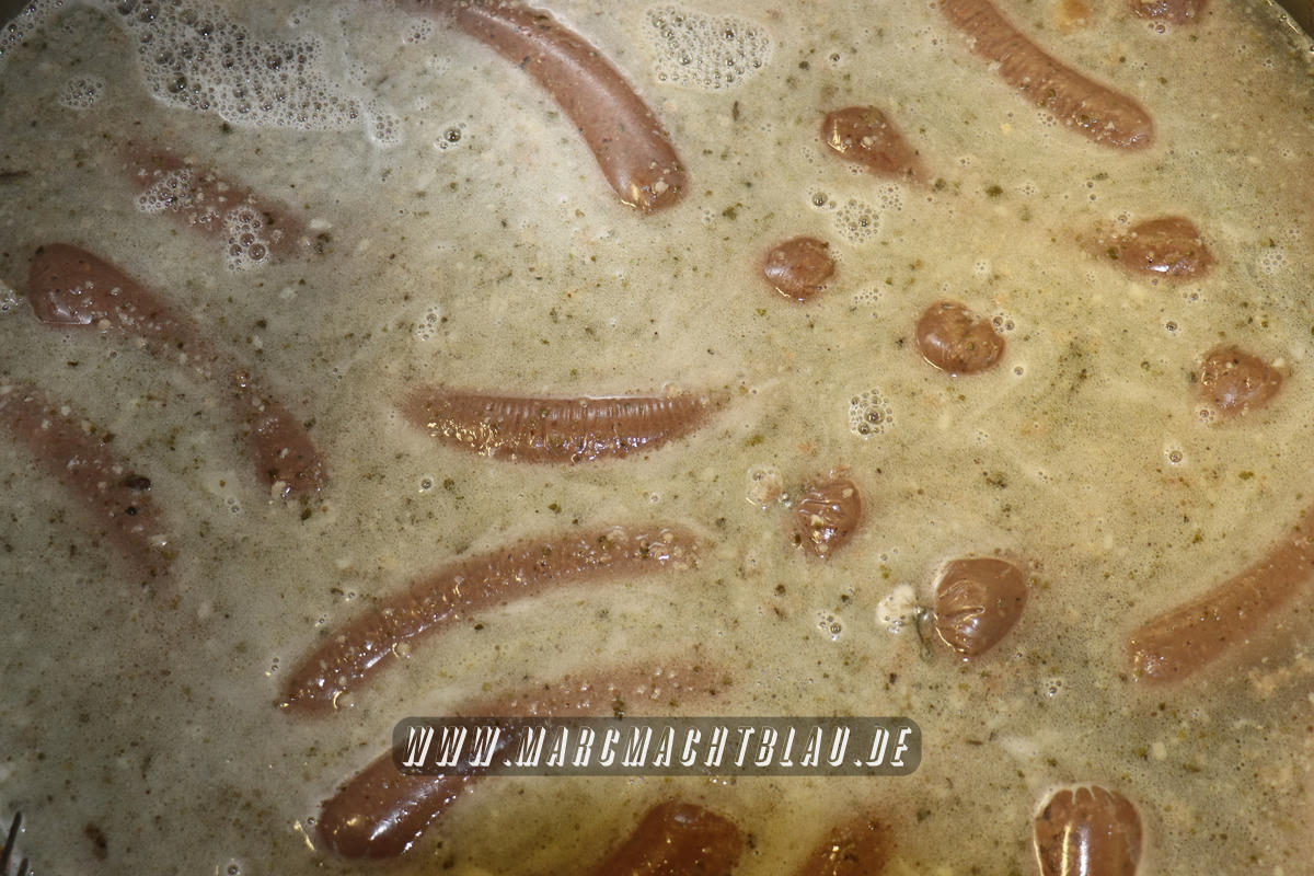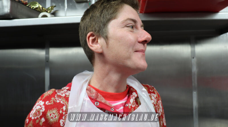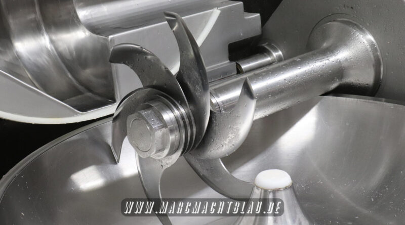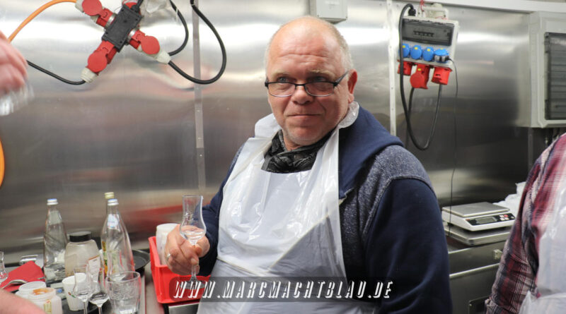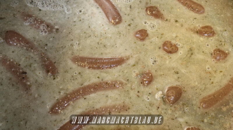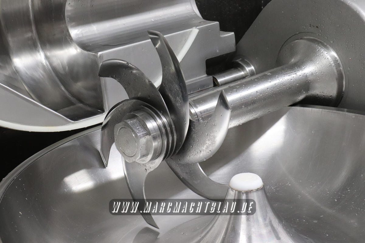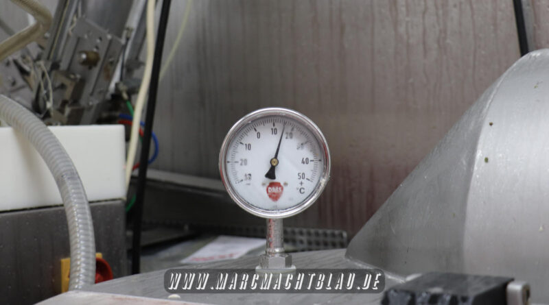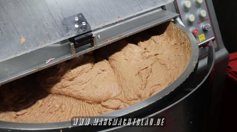 Wir betreten das erste Mal die “Heilige Halle des Karl”. Ein großer sehr sauberer Raum mit vielen unterschiedlichen Maschinen, übergroße Töpfe, Kippbratpfanne, Cutter, Fleischwolf Wurstfüller, großen Arbeitsflächen und seinem ganzen Stolz dem Räucherofen. Eine tolle professionelle Ausrüstung und wir sehen auch warum. Wie und was für eine Qualität an Wurst, Karl und seine zwei Kollegen herstellen ist wirklich beeindruckend.