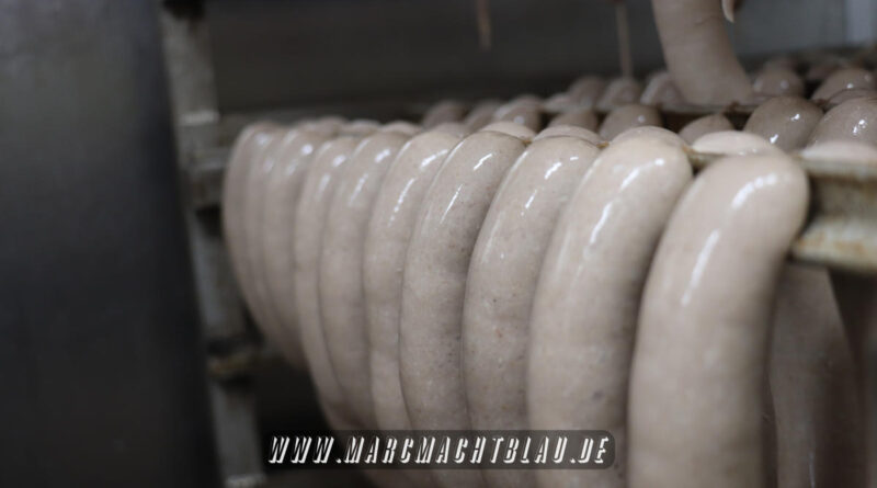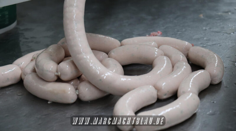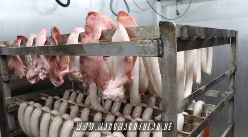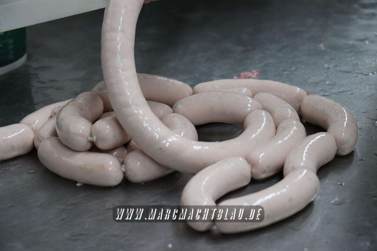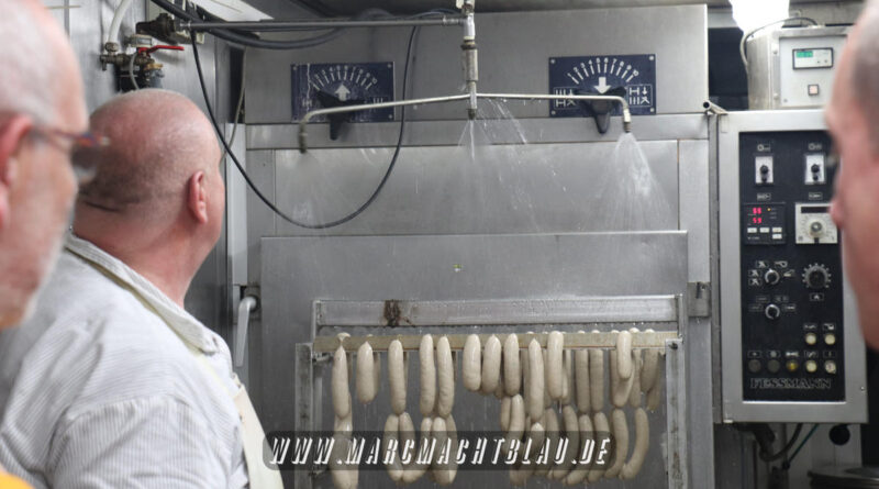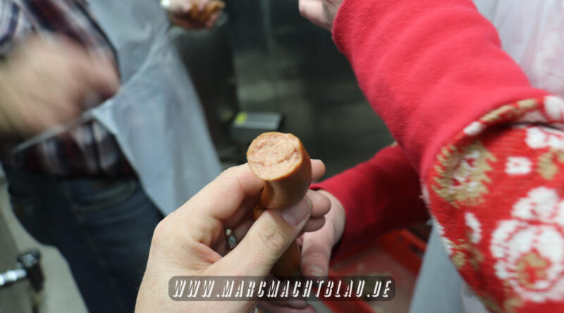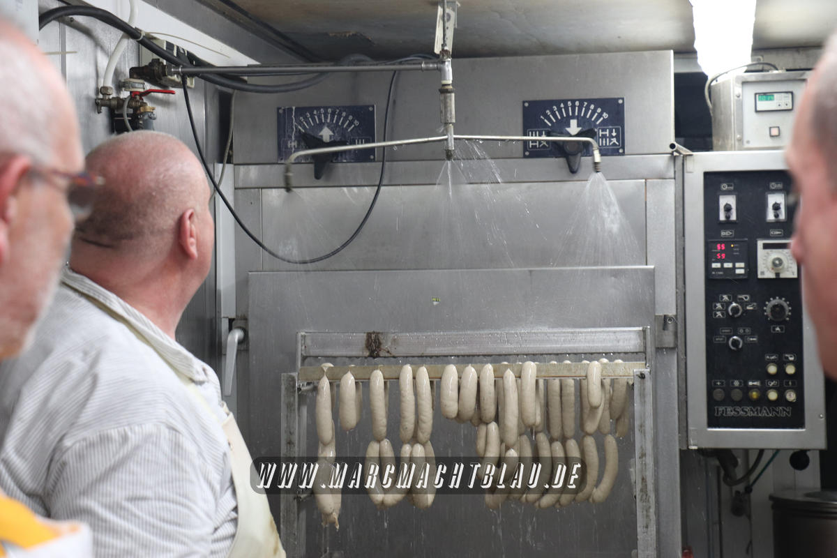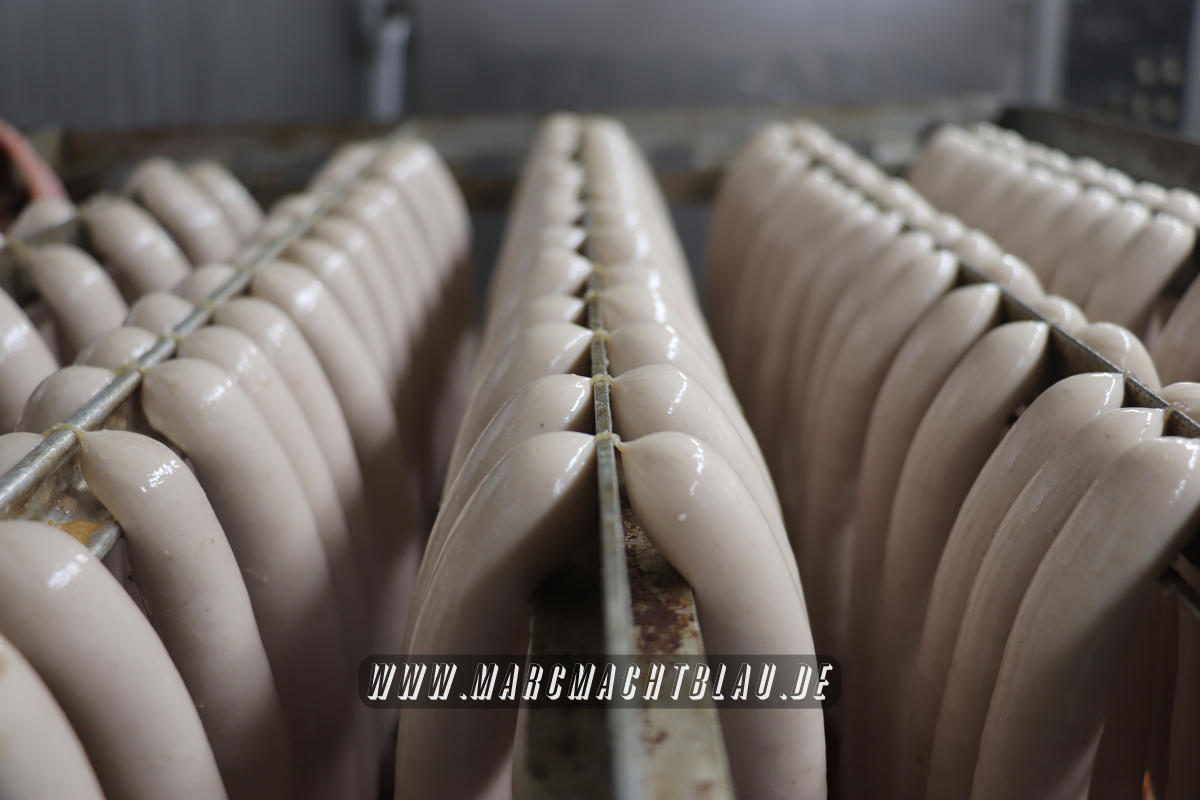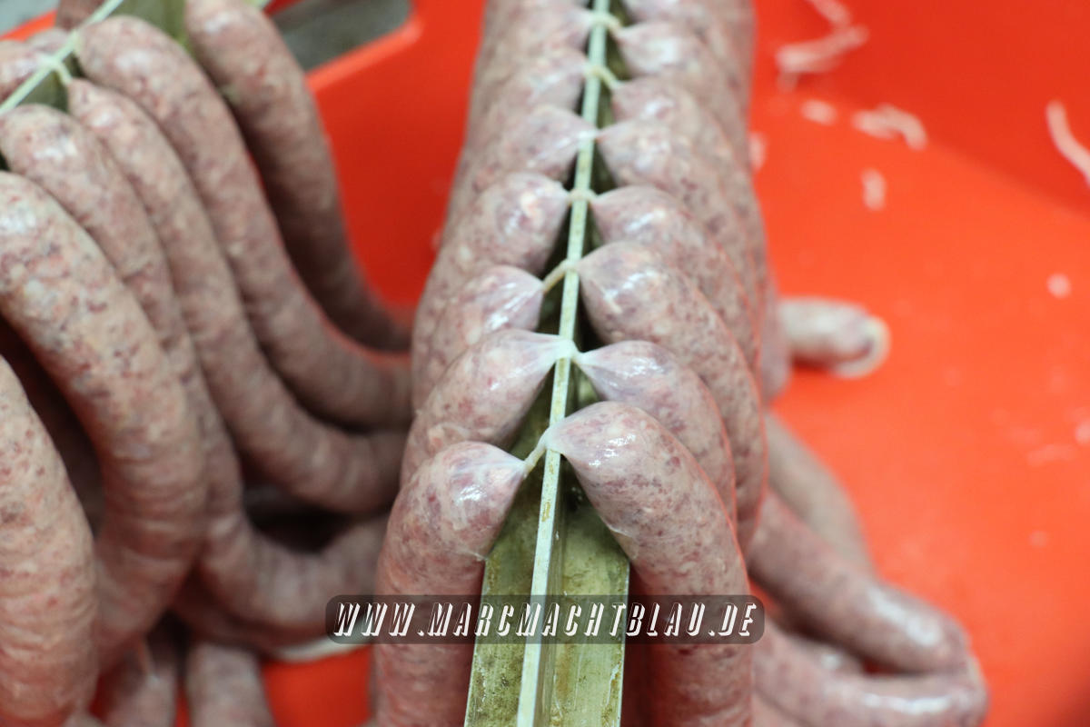 Uns wurde bei der Wurstherstellung vom Ausbeinen des Fleisches über das Wolfen und Cuttern zu einer Farce/ Brät bishin zur fast automatischen Abfüllung in den Darm alles gezeigt. Danach werden die Würste entweder noch gebrüht oder im Räucherofen gegart.