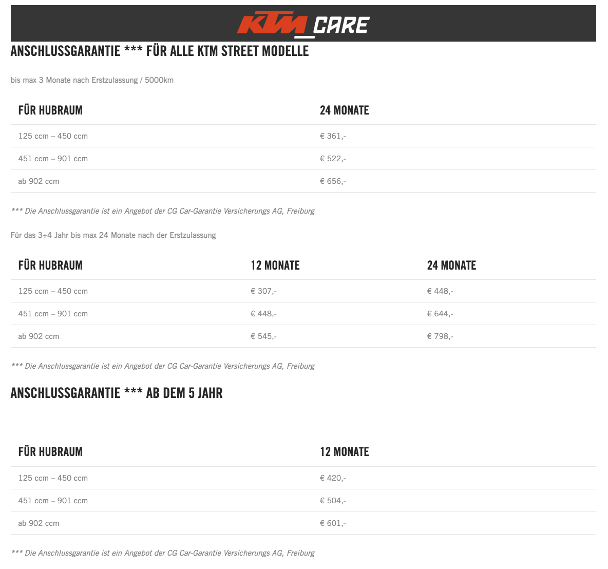 Ein interessanter Vergleich ist der mit unserem Auto, einem Seat Ateca. Dieses kostet bei gleichem Alter rund 200 € weniger im Jahr in der Garantieverlängerung. Ein deutlicher Unterschied, der uns zu Überlegungen darüber veranlasst, ob die Investition in die KTM-Garantieverlängerung noch gerechtfertigt ist.