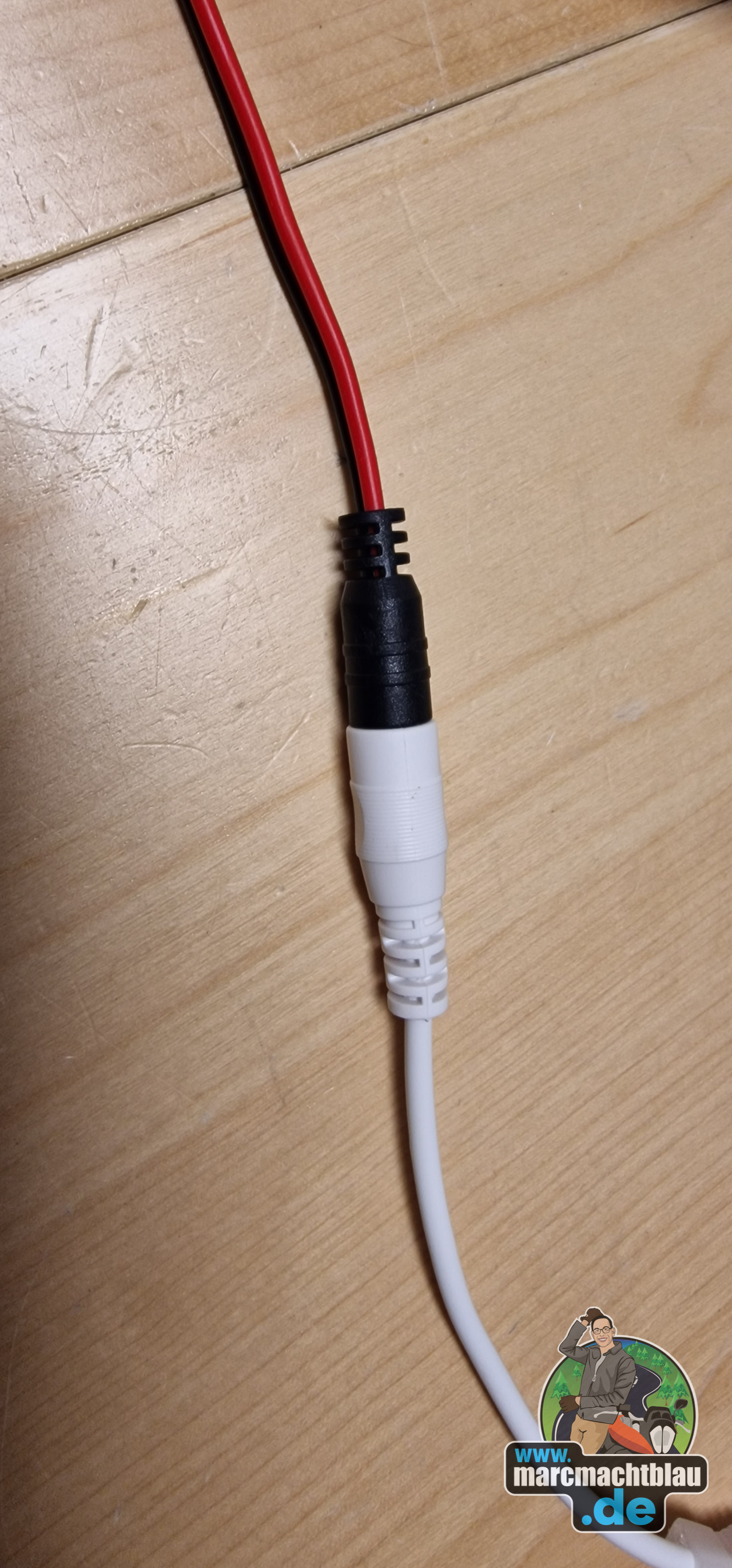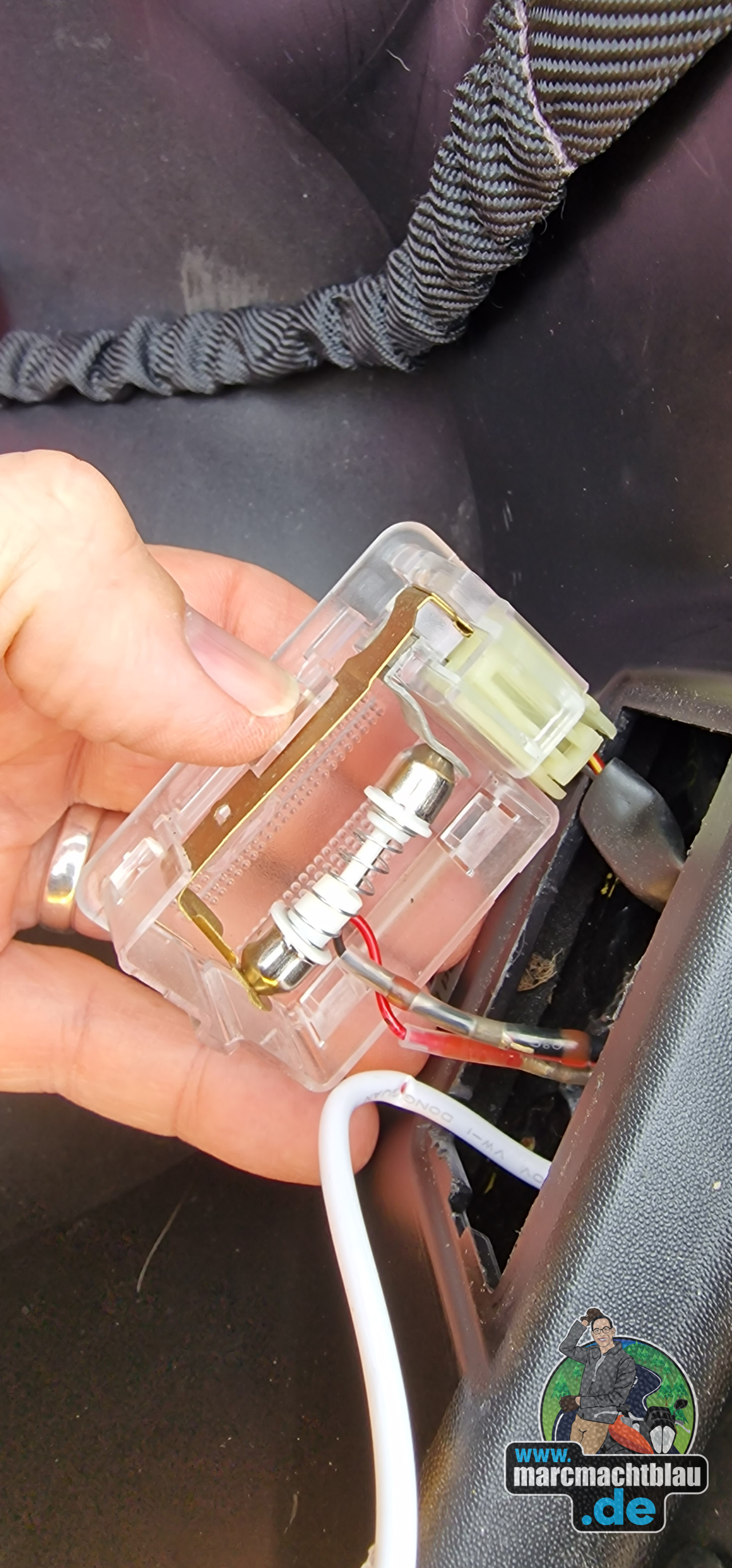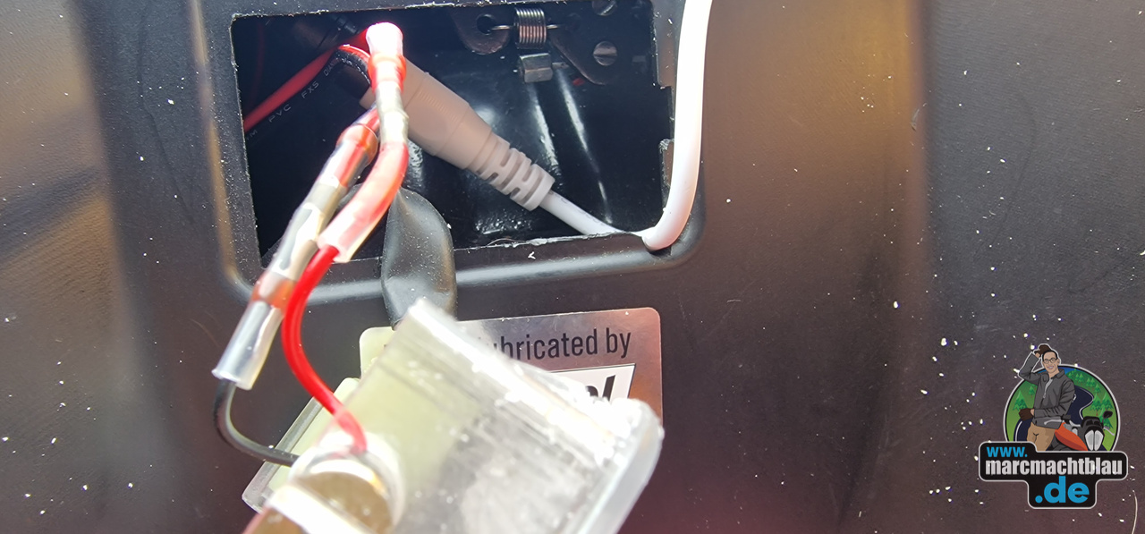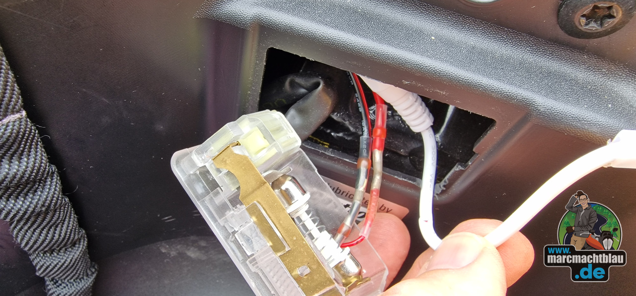 Damit der LED-Streifen an die originale Lampenfassung angeschlossen werden kann, habe ich mir einen passenden Soffitten-Adapter* besorgt. Dieser wird einfach anstelle der Birne in die Fassung gesteckt, und die Kabel können dann über das Kabel mit Stecker* direkt mit dem LED-Streifen verbunden werden – ganz ohne Löten oder Basteln am Kabelbaum. Dazu habe verwende ich meist, die wasserdichte Schrumpfverbinder*. Halten bombenfest und sind wasserdicht. Das Einzige, was man dazu benötigt, ist eine Zange, um die Kabel etwas abzuisolieren und ein Feuerzeug.