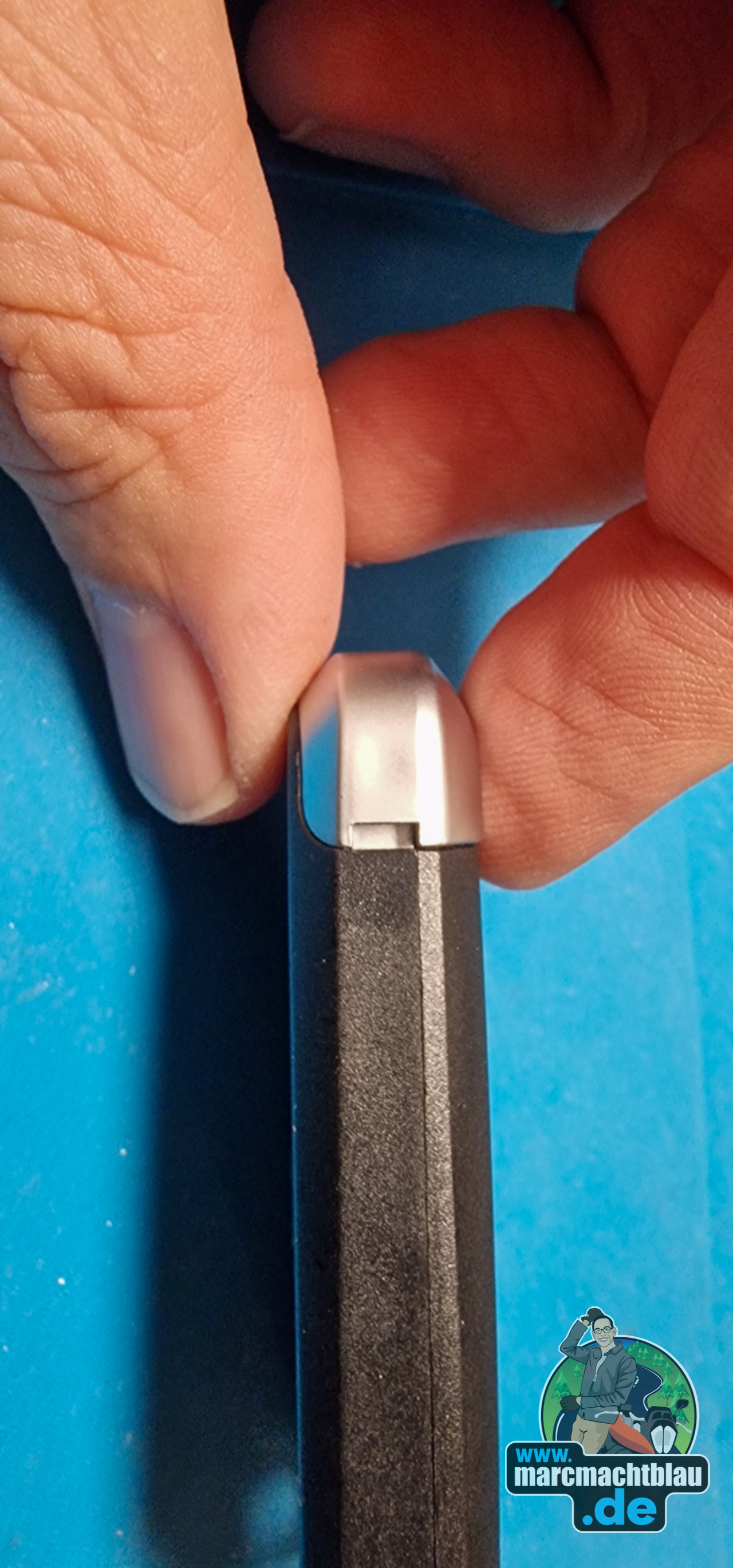 - Naht finden: Rundum verläuft eine schmale Gehäusenaht. Dort vorsichtig einstecken.